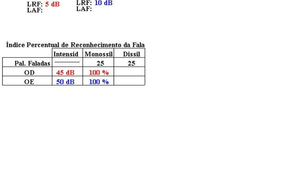 Fazem parte da Audiometria Vocal o Indice Percentual de Reconhecimento de Fala (IPFR), o Limiar de Reconhecimento de Fala (LRF) e quando necessário o Limiar de Audibilidade de Fala (LAF).